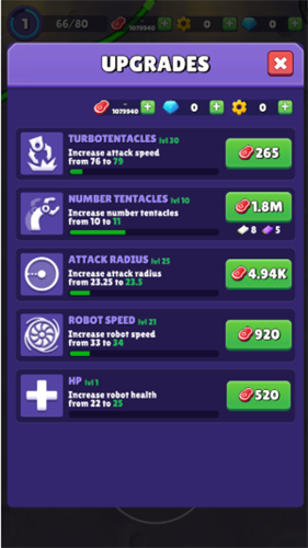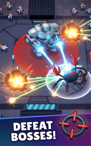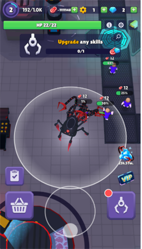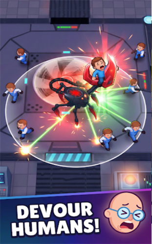 - 放置角色扮演成长:与传统的点击类游戏不同,即使你不在,你的机器人蜘蛛也会不断变强。升级你的利爪、盔甲和速度,成为一台势不可挡的机器。