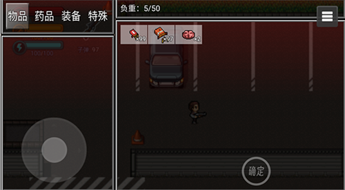2、左下角是操作轮盘控制角色奔跑和行走的方向,右边则是攻击,以及物品栏装备栏,切换奔跑状态和确认键