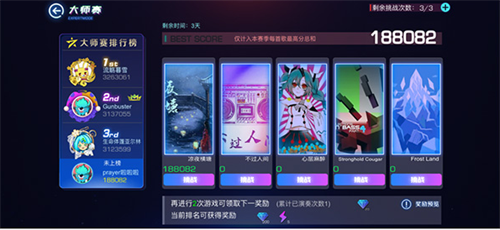 在【大师赛】中,达人们可以通过界面下方的“奖励预览”中看到排名奖励与累积奖励,界面上方的分数进度条代表达人们在本赛季获得的每首歌曲最高分的总和,这个分数也是大师赛排行榜的排名依据呢~达人们,努力上榜吧!