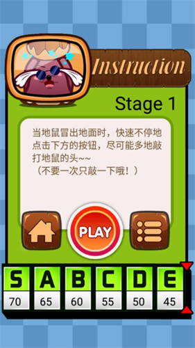 2、当地鼠冒出地面的时候,要快速不停的点击下方的按钮,要尽量多的敲打,但是地鼠如果钻到下面去了请马上停止敲打,因为敲空了会扣分的。