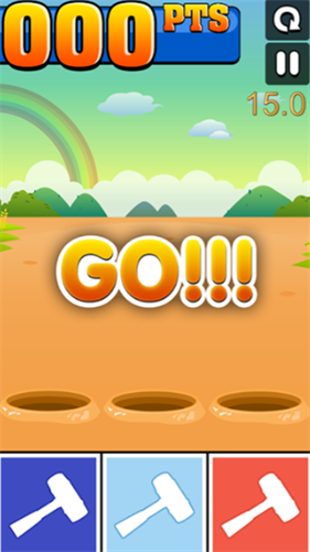 3、下面可以看出是游戏实际操作图,下面三个锤子对应三个洞,大家要准确的敲打。第一不能直接点击地鼠,第二要点击对应的锤子。