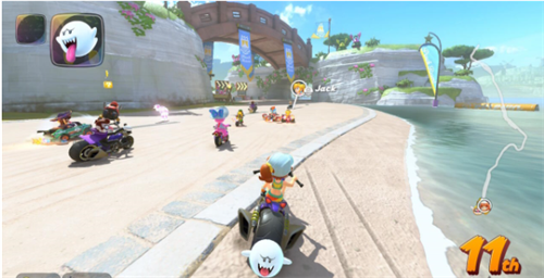 “幽灵”道具(Boo)从前作中回归,《马里奥赛车 世界》为它赋予了新的功能。使用幽灵道具时,玩家在越野路段不会受到速度惩罚。这种效果曾在《马里奥赛车DS》中出现过,但在后续作品中被取消。通常情况下,玩家需要借助蘑菇等道具才能在越野路段加速,而使用幽灵道具则完全免去了减速困扰。