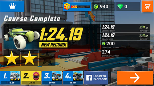5、整个过程其实也并不算难,只要保证不翻车,顺顺利利的到达终点即可,关卡的结算界面显示的就是玩家的总用时和获胜星数。