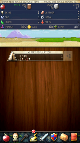 文明创世者汉化版是点击放置式的策略类游戏,你需要不断收集资源,该游戏采用了传统经典的像素风格,从简单的色彩搭配,到极富策略的游戏战争玩法,玩家将通过点击收集游戏中的食物、木头以及石头来添加的自己的库存,并使用这些素材,建造更多住所,住所的建造能够为你供给人员资源,通过雇佣并分配你的工人收集基础性的资源物质,在这里玩需要考虑的就是,人口的招募会消耗一定量的食物,若在收集过程中,开销大于归入,那么关于玩家来说不只资源会越来越少,甚至还会削减人员数量。此外,在文明创始者中,除了基础性的食物、木头以及石头资源,还有各种更高档的资源物质,如动物毛皮、矿石、草药等,期间这些资源还能转化成成品的皮革和金币等,于此同时,游戏中还有各种特色建筑,不同的建筑会为你供给不同的功用,随着资源的积累,你还可以从中建立起自己的戎行,拓宽领地的开拓,亦可从中解锁更多全新科技以及才能。