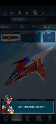 1、进入红色狩猎最新版本游戏后,点开【hangar】飞机库,去机库安装设备