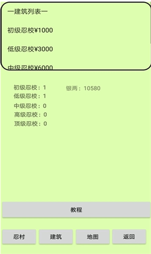 3、每30秒一年,每年忍校会毕业下忍,每一分钟忍者会自动晋级,建造更多的忍校可以毕业更多的忍者但有上限,想造更多忍校需要更多的忍村,更多的忍校能带来更多的任务金收入,建筑列表可以上下滑动,单击玩家自己的村子可以获得初级建造上限增加,长按可批量建造十个忍校,困难模式需要打赢木酒,最低战力是5000000,战力会增加。