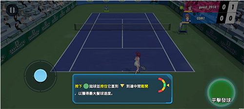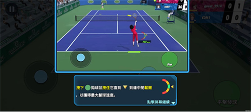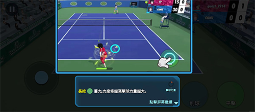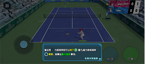 4、当出现削球安按钮时就可以按下平击按钮蓄力,当力满时松开,能击出最大速度的网球;