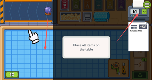 1、进入游戏,将跟随着手指的指示,将物品拖动到桌子上;