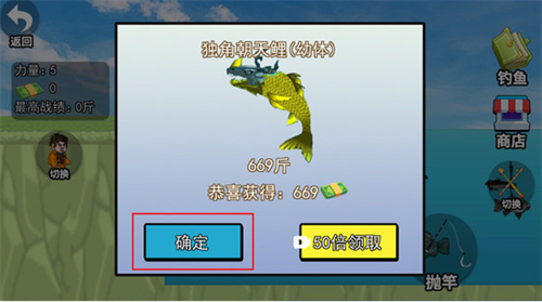 6、被钓上来的小鱼会有一个信息展示弹窗,查看完后可以点击【确定】按钮,完成一次钓鱼,现在,你已经是个高手了,去尝试钓一条鱼王吧~