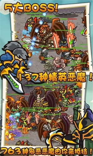 1、组成玩家自己喜欢的战术来应对由5个恶魔BOSS领导的数百种形态各异恶魔组成的死灵军团进攻。