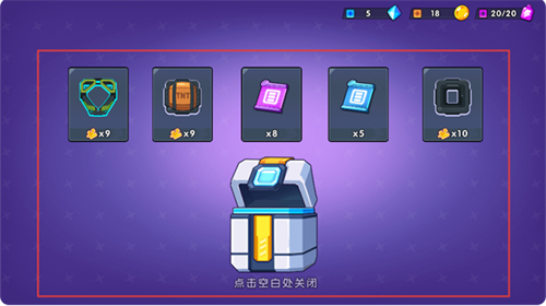 4、宝箱开启后,查看获得的零件、材料等奖励,点击空白处即可关闭奖励界面。