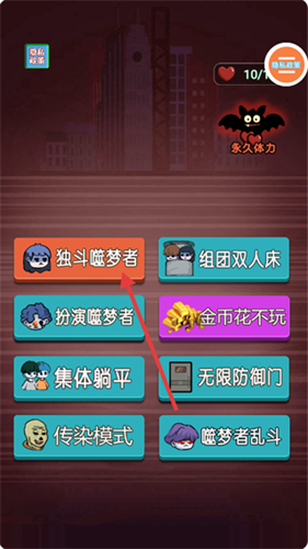 1、在主界面点击【独斗噬梦者】模式,进入对局后快速选择空房间,点击上床完成躺平。