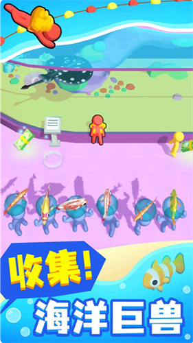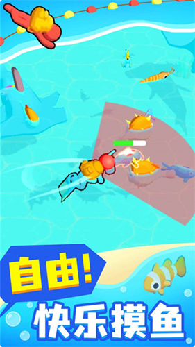 2、自由快乐摸鱼,简单的滑动屏幕来控制角色的移动,摸到更多品种的鱼,可以选择出售或展示展览;